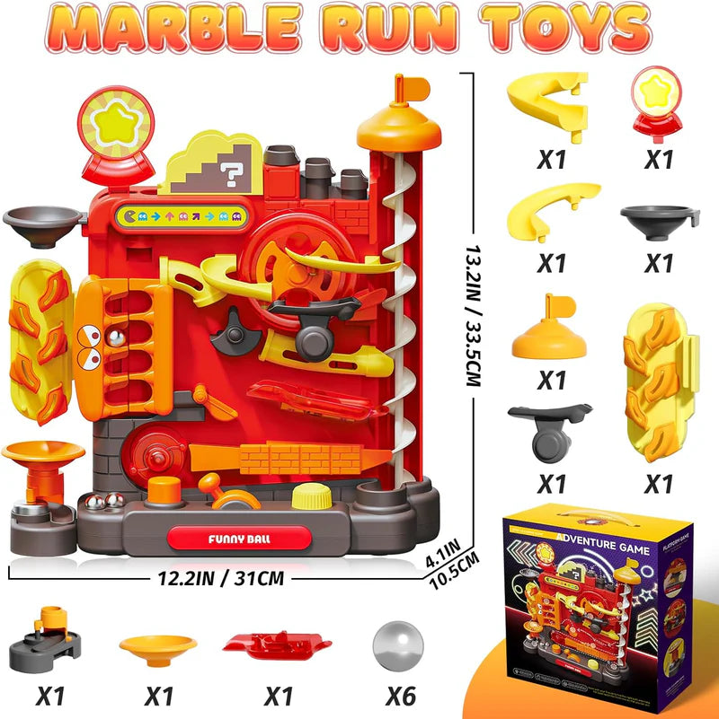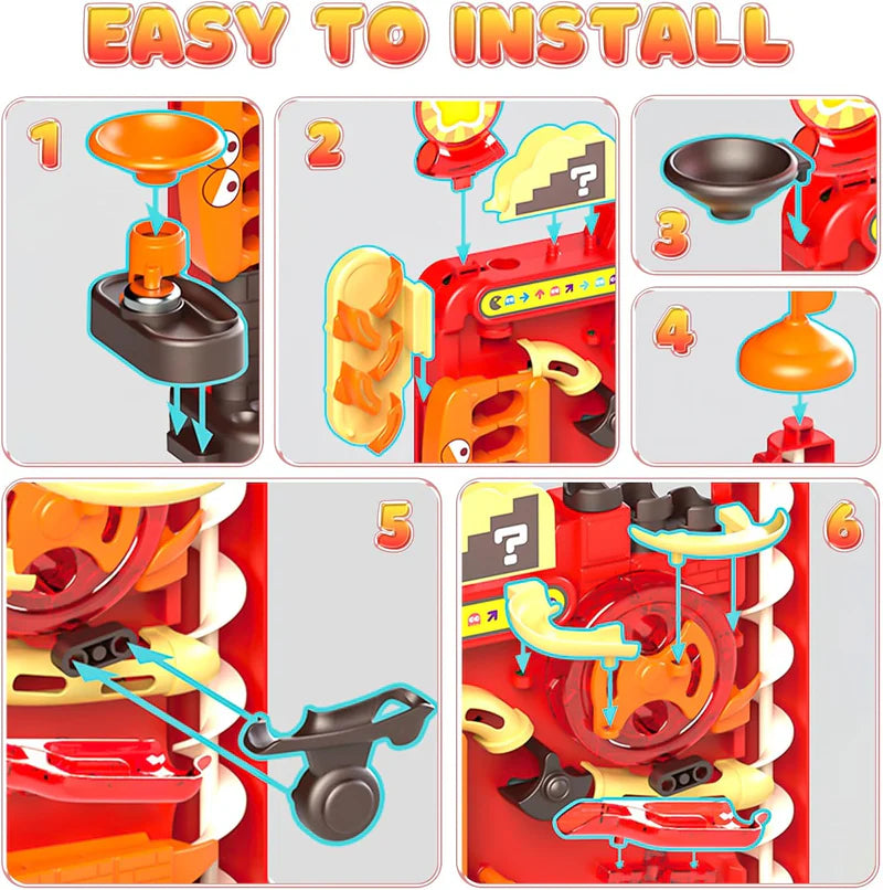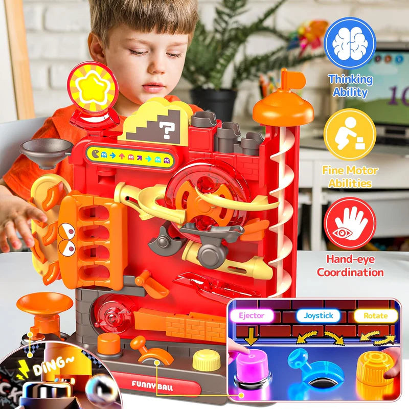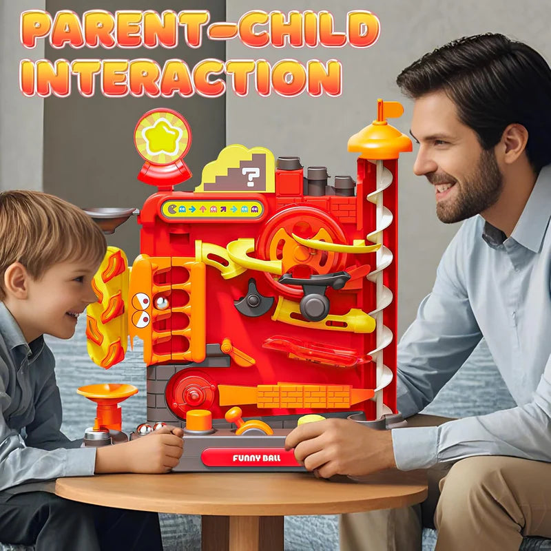 Супер забавна и образователна игра, която развива логическото мислене, концентрацията и фината моторика на детето. Всяко топче преминава през различни механизми, лостове, колела и спускания – детето контролира движението и се учи да планира и наблюдава! 🤩